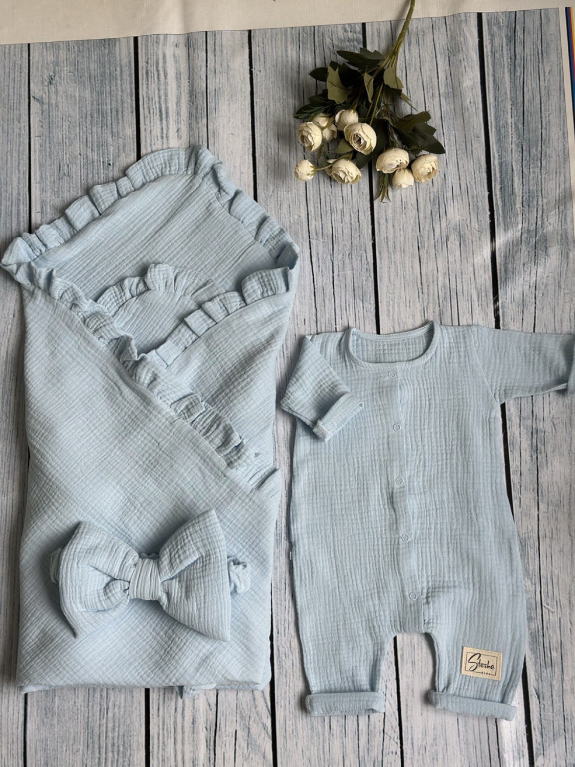 Теги: Купить детские конверты, комбинезон оптом, детские конверты на выписку оптом. 335-Г. Комплект из детского комбинезона, р 56 и конверта муслин, хлопок 100% 90/90 см, голубой цена,отзывы официальный сайт "Стеша Владимир"