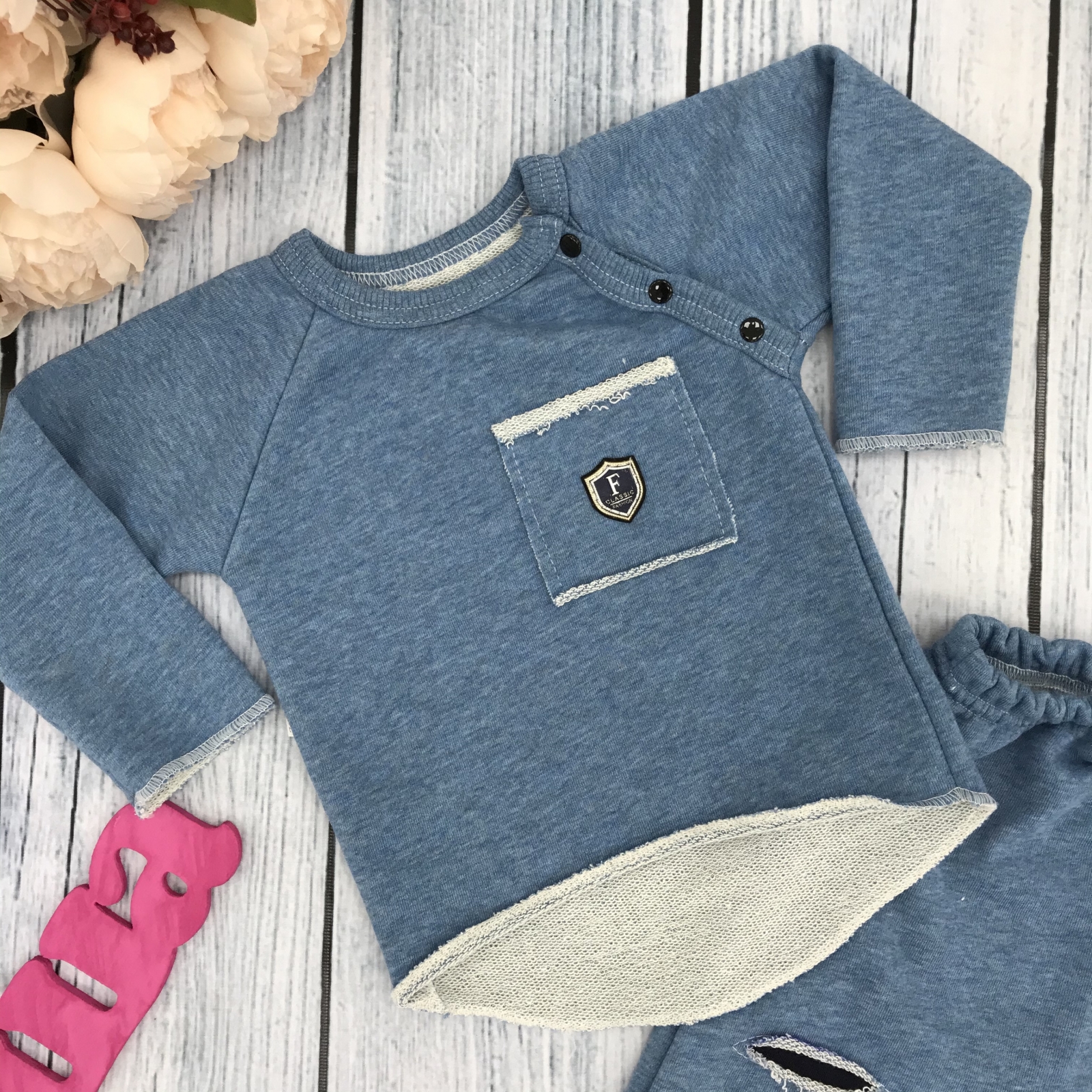 239. Костюм ясельный, хлопок 65%, 35% ПЭ, 3-х нитка футер без начеса, джинса 74,80,86